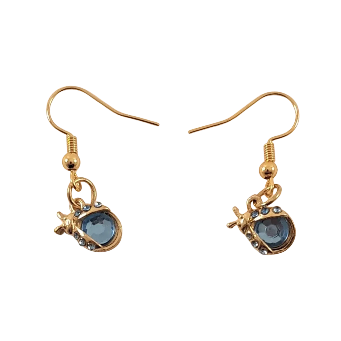 Each earring features a delicate beetle-shaped charm, carefully detailed with vibrant blue gemstones that shimmer with every movement. The soft gold plating adds a refined warmth, making these ladybug earrings gold-toned an easy match for both everyday and evening outfits.