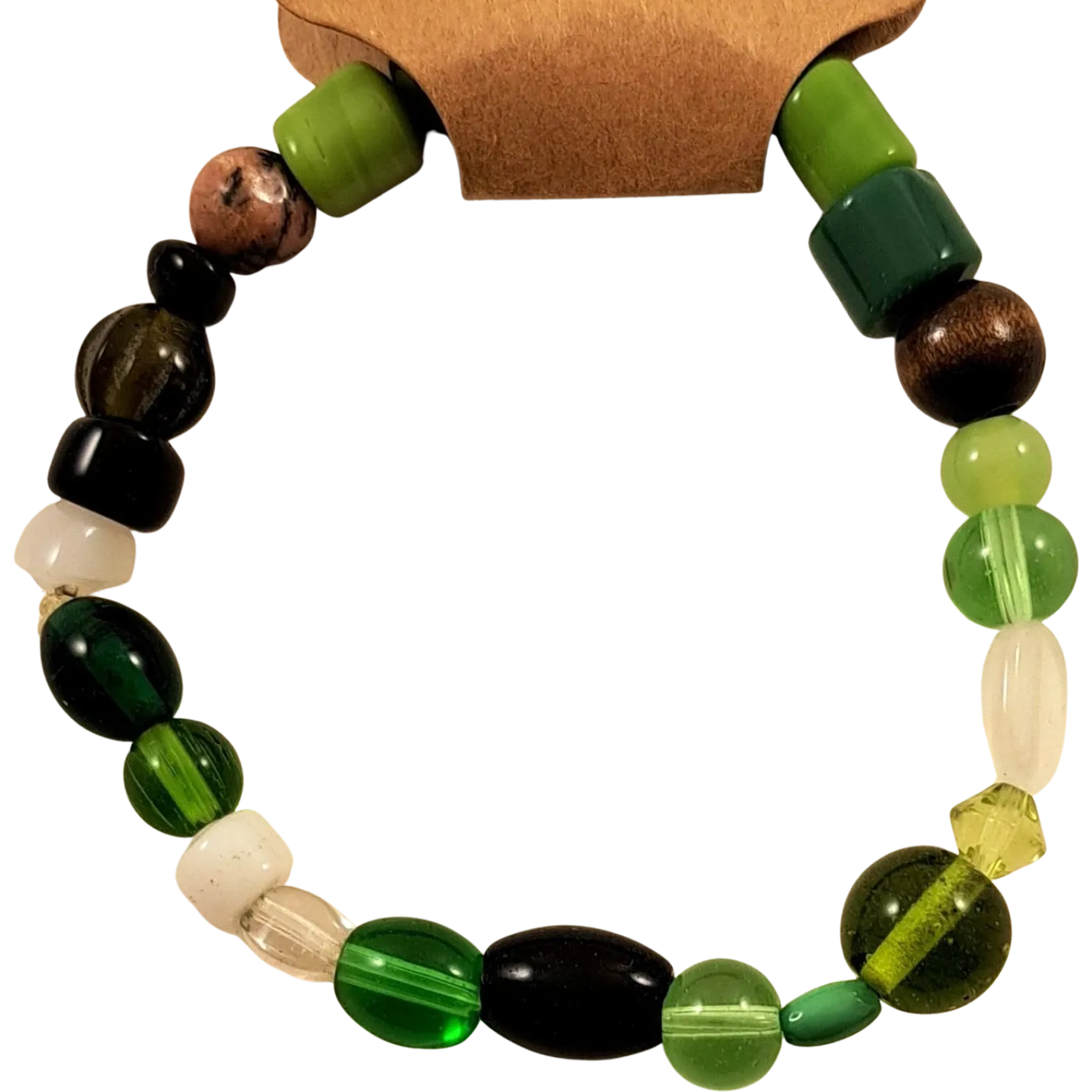 The Green and Black Bracelet from Capstone Hemp is a stylish, handmade piece that blends earthy tones with modern charm. This unique accessory combines wooden and plastic beads in rich black, deep green, and light green shades. The design is strung on a flexible stretch cord, ensuring both comfort and a snug fit.