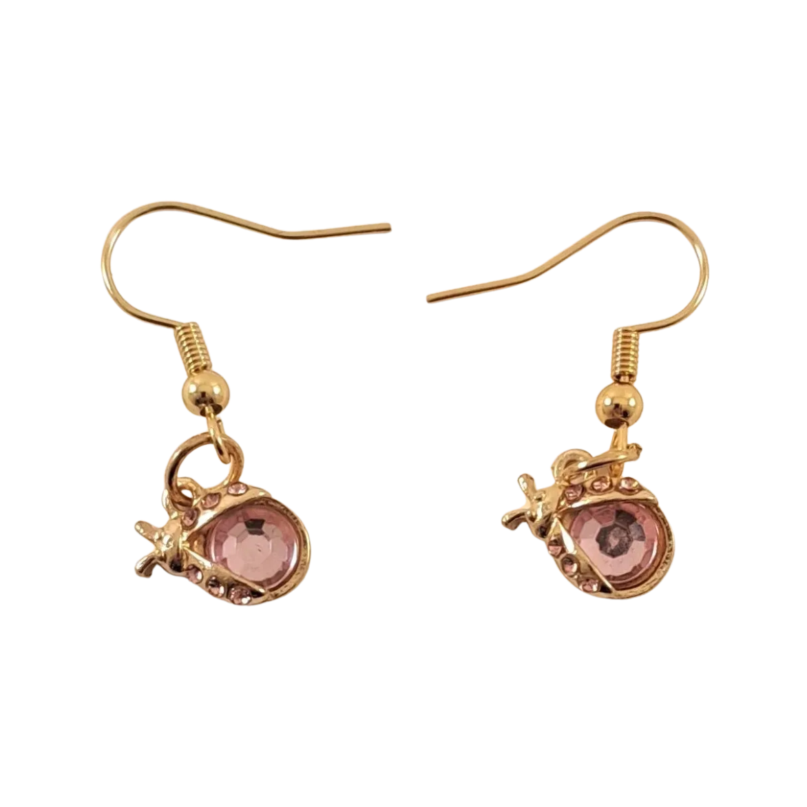 Crafted from gold-plated metal, each earring showcases a petite ladybug shape accented by light pink crystals. The subtle sparkle and fine detail offer a polished yet approachable vibe. These earrings make a statement without overwhelming your look, ideal for both everyday wear and special occasions.