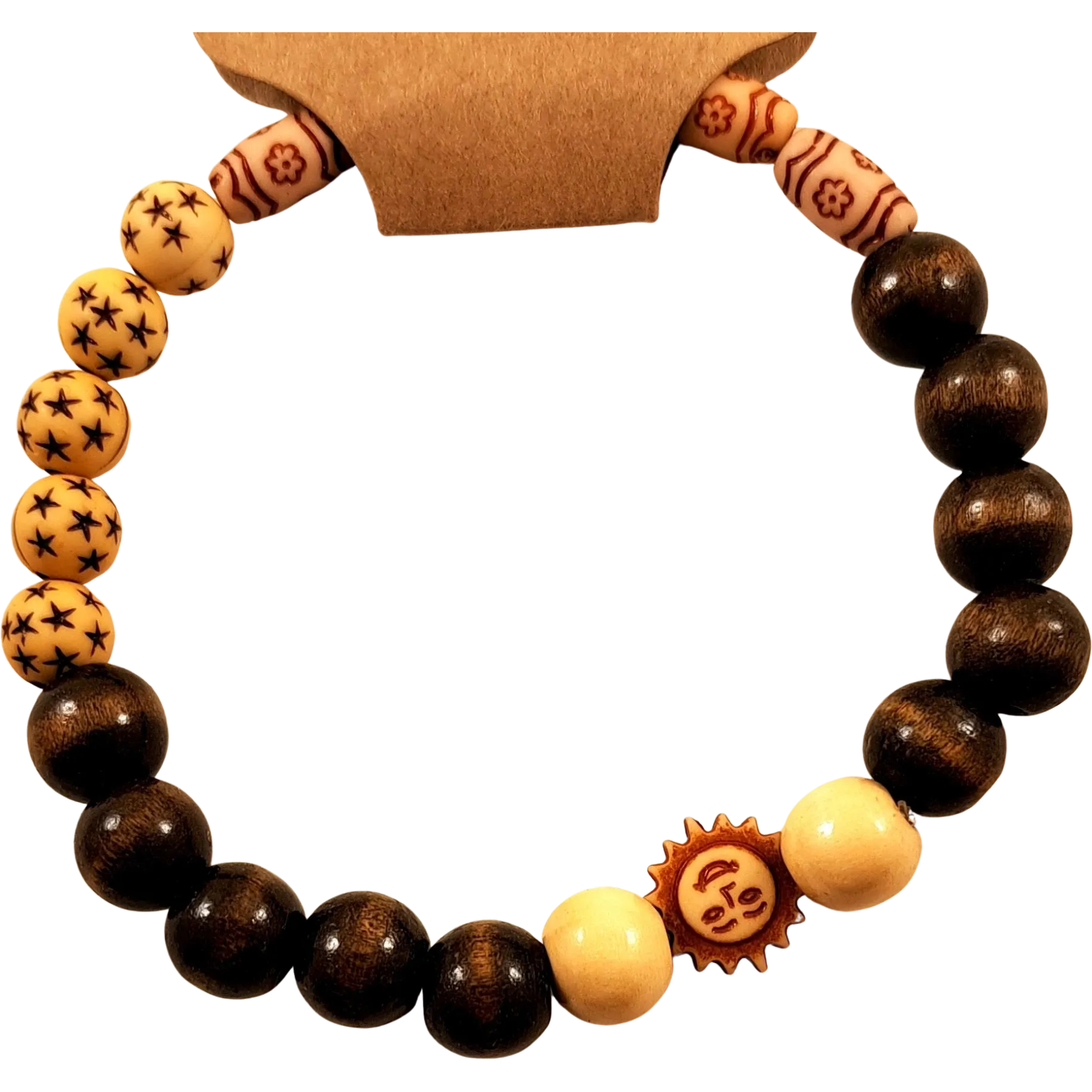 Material: Natural wooden beads + engraved smiling sun centerpiece