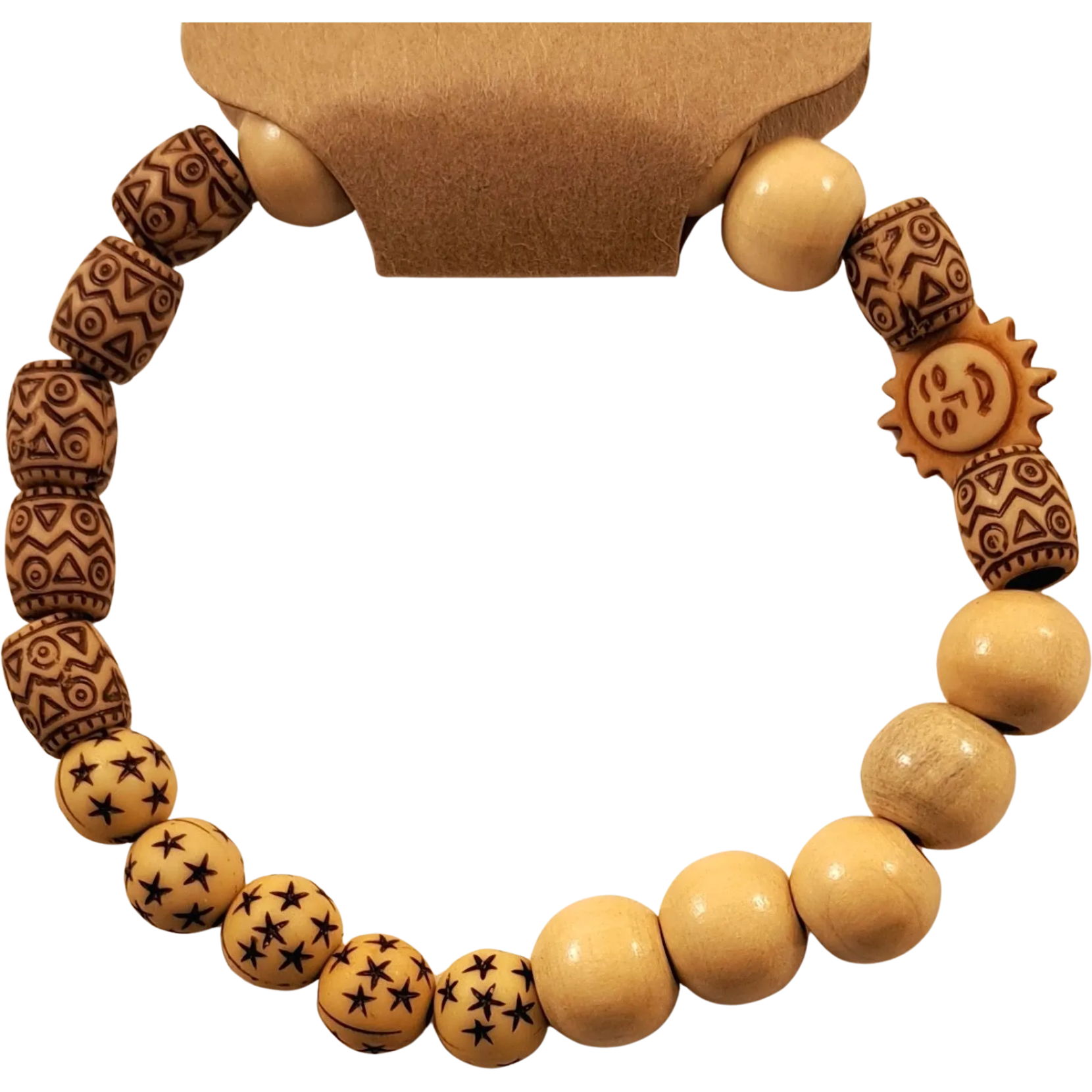 Introducing the handcrafted Smiling Sun, Stars, and Symbols Bracelet from Capstone Hemp, a captivating accessory that blends celestial charm with tribal-inspired symbols. Made with a creative mix of wooden and plastic beads, this bracelet features engraved star patterns, tribal shapes, and a smiling sun motif that radiates warmth and positivity. Designed on a durable stretch cord, it offers comfort along with adjustable wear.