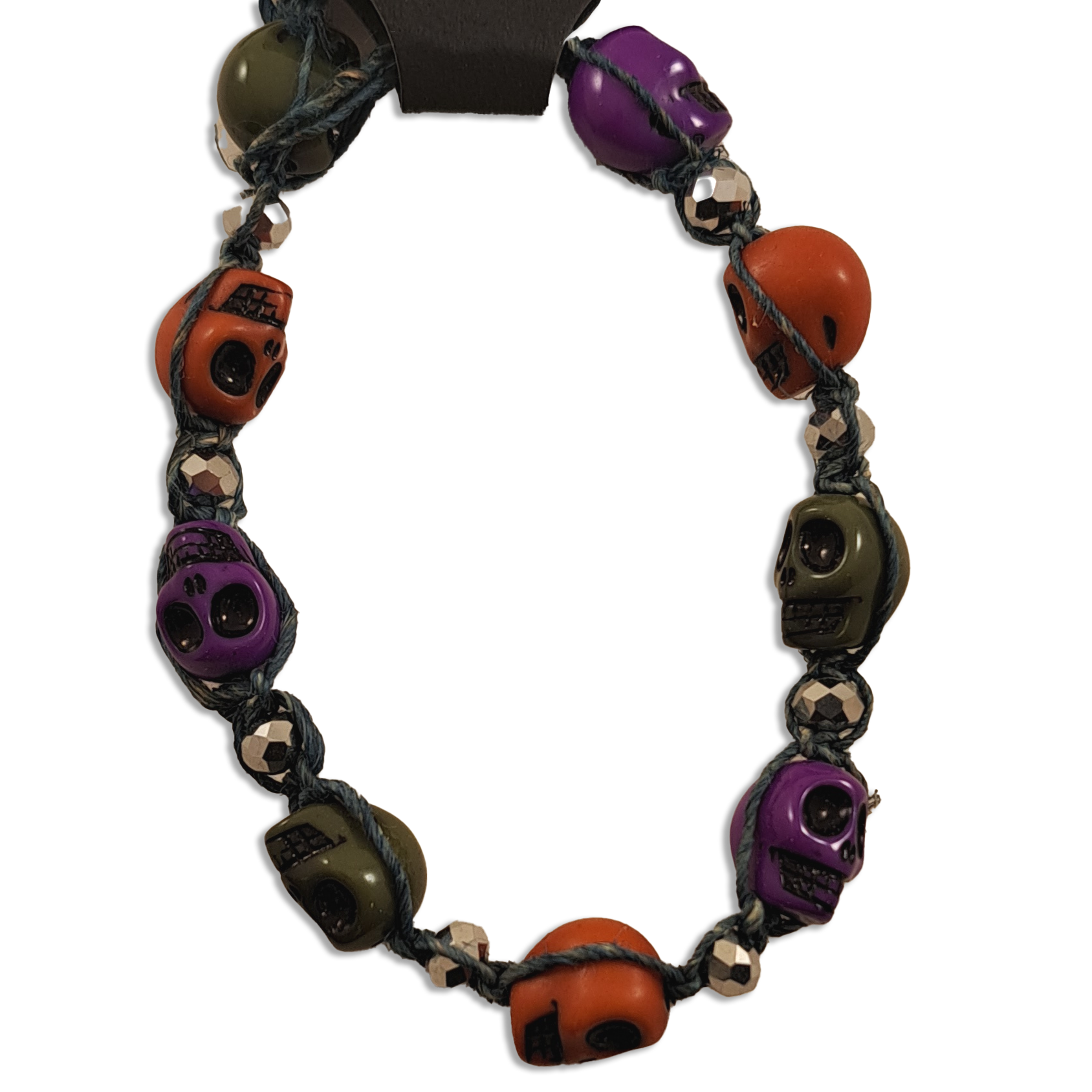 Features plastic skull beads on a rustic hemp cord